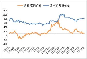焊鍍管廠綜合生產(chǎn)利潤(rùn)壓縮。1月結(jié)算周期內(nèi)焊管廠平均盈利收窄至30元,螺旋管、架子管受季節(jié)性影響更甚;鍍鋅管由于原料鋅錠價(jià)格震蕩偏高,而月上旬管廠為促進(jìn)貿(mào)易商冬儲(chǔ)拿貨,采取漲價(jià)不漲的保價(jià)原則,上下受壓;月中下旬冬儲(chǔ)政策落地,折算含稅出廠價(jià)格5400-5600元,實(shí)質(zhì)利潤(rùn)空間同樣受限。