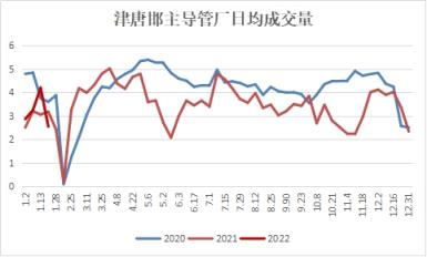 焊鍍管廠冬儲(chǔ)水平偏低。據(jù)網(wǎng)調(diào)研,截至1月21日,天津唐山邯鄲主流管廠廠內(nèi)總體庫(kù)存67.82萬噸,比上月同期降1.45萬噸,下降2.09%;比去年農(nóng)歷同期降11.63萬噸,下降14.64%。廠內(nèi)原料帶鋼庫(kù)存24.55萬噸,比上月同期降7.11萬噸,比去年農(nóng)歷同期降7.32萬噸;焊管庫(kù)存15.47萬噸,比上月同期增0.31萬噸,比去年農(nóng)歷同期降1.84萬噸;鍍鋅管庫(kù)存27.8萬噸,比上月同期增5.35萬噸,比去年農(nóng)歷同期降2.47萬噸。1月中旬左右因冬奧會(huì)管控供應(yīng)階段偏緊預(yù)期出現(xiàn),但市場(chǎng)普遍對(duì)2月行情回暖高度及周期看法謹(jǐn)慎,加工類及協(xié)議貿(mào)易商多理性冬儲(chǔ),整體庫(kù)存控制在15-20天銷量左右,部分地區(qū)受工程回款及疫情影響較大,庫(kù)存偏低。1月20-25日北方管廠陸續(xù)停產(chǎn)放假,在產(chǎn)產(chǎn)能利用率下降至62.55%;南方部分管廠接年后訂單幾千噸至萬噸左右,產(chǎn)線在28日-29日左右停工,原料儲(chǔ)備至2月用量(見圖4)。