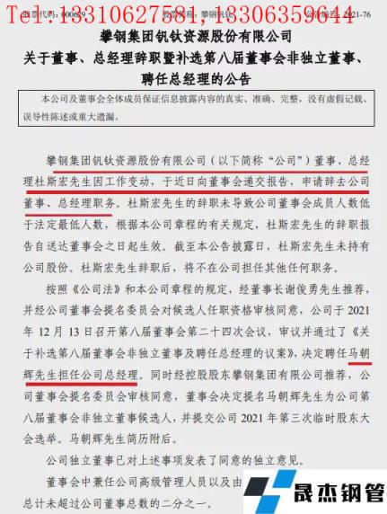 12月13日,攀鋼釩鈦董事會收到公司董事、總經(jīng)理杜斯宏因工作變動,于近日向董事會遞交報告,申請辭去公司董事、總經(jīng)理職務(wù)。杜斯宏的辭職未導(dǎo)致公司董事會成員人數(shù)低于法定最低人數(shù),根據(jù)本公司章程的有關(guān)規(guī)定,杜斯宏的辭職報告自送達(dá)董事會之日起生效。截至本公告披露日,杜斯宏未持有公司股份。杜斯宏辭職后,將不在公司擔(dān)任其他任何職務(wù)。