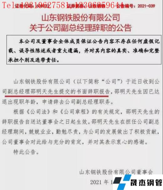 12月1日,山東鋼鐵發(fā)布公告稱,于近日收到公司副總經(jīng)理邵明天先生提交的書面辭職報告。邵明天先生因已達(dá)退出現(xiàn)職年齡,申請辭去公司副總經(jīng)理職務(wù)。