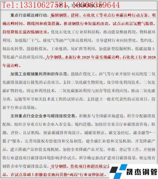制定工業領域碳達峰實施方案和鋼鐵、建材、石化化工等重點行業碳達峰行動方案,推動煤炭等化石能源清潔高效利用,提高可再生能源應用比重,有序推進鋼鐵、建材等行業碳達峰工作。加快低碳技術開發,圍繞鋼鐵、化工等重點行業,推動化石能源清潔高效利用等低碳技術,開發一批前瞻性、戰略性、顛覆性技術。到2025年,推廣50項綠色低碳先進適用技術。加快工業互聯網、5G等新一代信息技術在綠色制造領域的應用,到2025年,規模以上制造業企業關鍵業務環節全面數字化比例超過50%,鋼鐵、水泥(熟料)等行業重點企業能源管理平臺創建率達到100%。