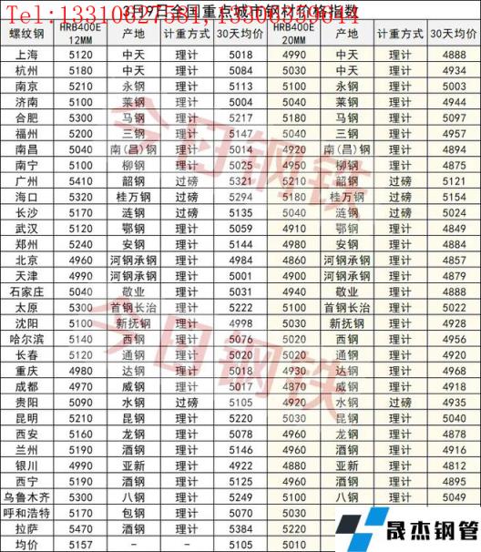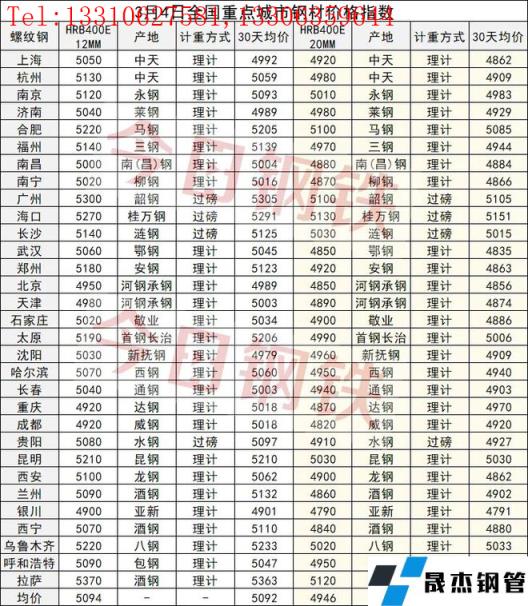 截至3月9日,全國主要城市20mm三級抗震螺紋鋼均價5010元/噸,周環比上漲64元/噸;12mmHRB400三級抗震螺紋鋼均價5157元/噸,周環比上漲63元/噸。以下為3月4日與3月9日全國重點城市螺紋鋼價格指數對比情況: