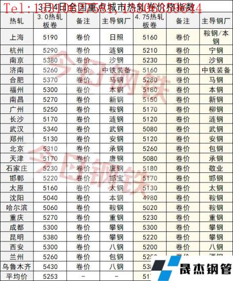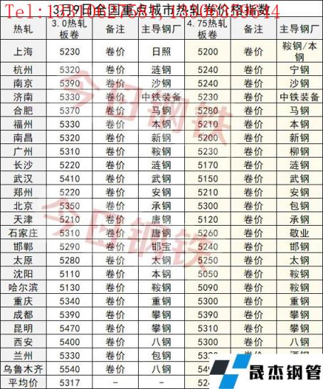 截至3月9日,全國主要城市3.0熱軋板卷均價5317元/噸,周環比上漲64元/噸;4.75熱軋板卷均價5241元/噸,周環比上漲63元/噸。以下為3月4日與3月9日全國重點城市熱軋板卷價格指數對比情況: