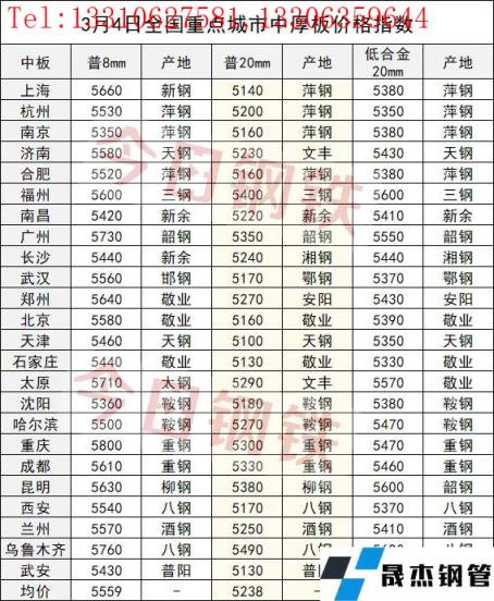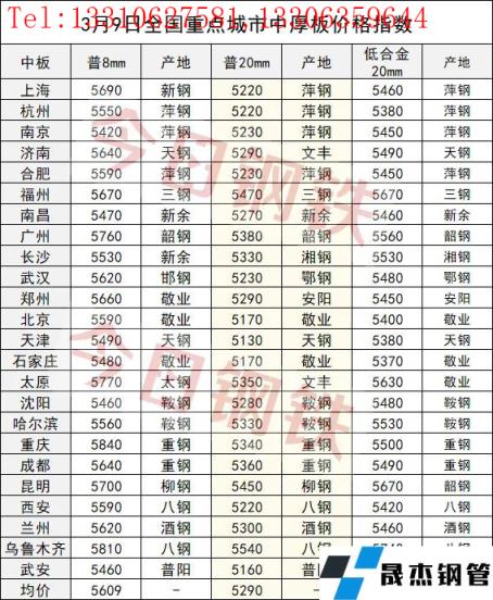 截至3月9日,全國主要城市普8mm中厚板均價5609元/噸,周環比上漲50元/噸;普20mm中厚板均價5290元/噸,周環比上漲52元/噸;低合金20mm均價5492元/噸,周環比上漲53元/噸。以下為3月4日與3月9日全國重點城市中厚板價格指數對比情況: