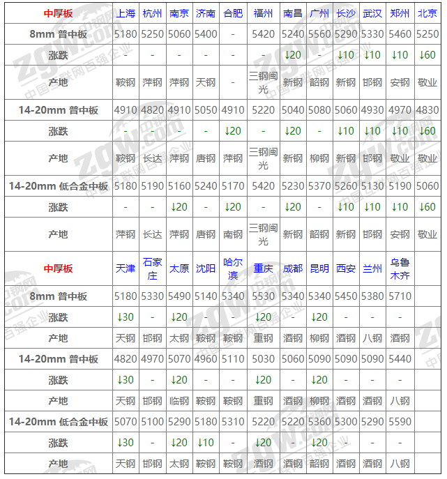 全國23個主要市場14-20mm 普中板平均價格5020元/噸,較上個交易日下調(diào)10元/噸。