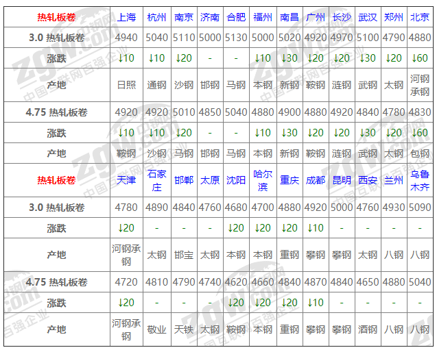 全國24個主要市場3.0 熱軋板卷平均價格4922元/噸,較上個交易日下調(diào)14元/噸。