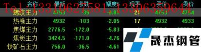 今日螺紋主力期貨跌39,收報4753,跌幅0.81%;熱卷主力跌103,收報4932,跌幅2.05%;焦煤主力跌172,收報2776.5,跌幅5.83%;焦炭主力跌171,收報3424.5,跌幅4.76%;鐵礦石主力跌36.5,收報756,跌幅4.61%。
