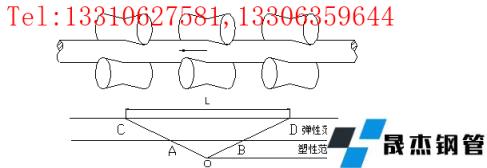 縱向彎曲矯直是使厚壁鋼管產(chǎn)生與彎曲相反方向的塑性變形來達(dá)到矯直彎曲的目的,而不彎曲的管子斷面只產(chǎn)生彈性變形,塑性變形區(qū)占支撐距的40%長度。