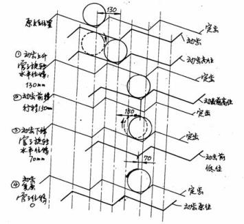 厚壁鋼管在同一個齒形內動作,如圖8-4。在一個周期內管子前移距離為四個步驟位移之和,等于130+(一150)十20+0=0。