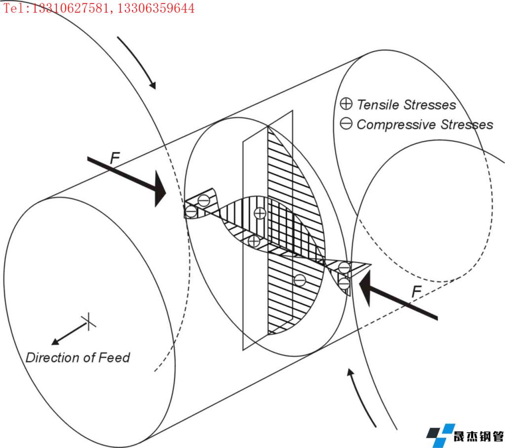 圖4-6顯示管坯的受力情況,圖中顯示F為軋輥方向(平面)的力,為壓應力,在接觸點的位置顯示為最大。中心部位(導盤方向)顯示為拉應力,理論上在導盤的中心部位受力為最大。因為管坯的不斷旋轉,同一部位的受力情況不斷變化,導致中心部位的金屬受到交變應力的作用,中心產生疏松,形成孔腔。