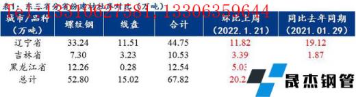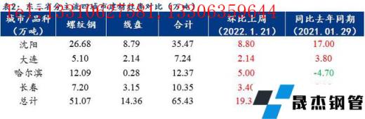 本周東三省建筑鋼材現貨庫存增加較多,增幅明顯超上周,其中螺紋鋼現貨庫存52.8萬噸,線盤15.02萬噸,建材社會庫存總量為67.82萬噸,較上周增20.24萬噸,增幅高達42.54%。隨著春節(jié)的臨近,北方下游終端工程進入全停工狀態(tài),需求已無,出貨趨零,加之各個無縫鋼管廠家廠庫前移至市場各倉庫的現貨相對較多,社庫開始大幅度累庫。