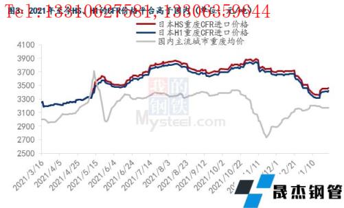 放開廢鋼進(jìn)口后的首年,進(jìn)口量卻不及預(yù)期,2021年進(jìn)口總量僅為55.5萬噸,遠(yuǎn)低于2019年之前平均每年200萬噸以上的水平。原因主要有兩方面:一是政策導(dǎo)向,2021年能夠入境的再生鋼鐵料所對應(yīng)的海關(guān)商品編碼只有5類,其對應(yīng)的海關(guān)編碼分別是:7204100010(鑄鐵碎料)、7204210010(不銹碎料)、7204290010(其他合金碎料)、7204410010(粉狀廢料)、7204490030(其他廢碎料),上述類別均屬于純凈的優(yōu)質(zhì)廢鋼,政策決定了廢鋼的進(jìn)口門檻變高;二是以日本優(yōu)質(zhì)重廢HS、H1為例,兩種料形的CFR價(jià)格平臺(tái)在2021年中均高于國內(nèi)主流城市的重廢均價(jià)(圖3),由于這兩種料形均屬于日本國內(nèi)的優(yōu)質(zhì)廢鋼,其資源量本身就有限,出口量不大,外加?xùn)|亞地區(qū)的其他國家也會(huì)從日本進(jìn)口該料形,所以這種優(yōu)質(zhì)廢鋼在2021年中基本處于供小于求的狀態(tài),價(jià)格因此高企。但以日本中廢H2為例,由于該料形要差于HS、H1,所以H2料形的CFR價(jià)格平臺(tái)接近國內(nèi)主流城市的中廢均價(jià)(圖4)。