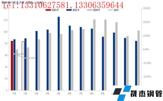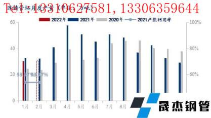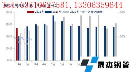 2、2022年2月管坯無(wú)縫厚壁鋼管廠(chǎng)家計(jì)劃排產(chǎn)83.5萬(wàn)噸,較1月份實(shí)際產(chǎn)量減少1.1萬(wàn)噸,2月份計(jì)劃產(chǎn)能利用率為53.98%,較1月實(shí)際產(chǎn)能利用率減少0.71%;