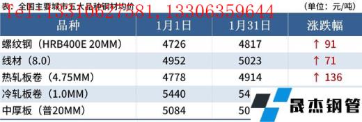 1月國內厚壁無縫鋼管市場整體呈現了震蕩偏強走勢,而板材價格分化明顯,螺紋鋼修復性反彈近百元,熱軋板卷上漲了136元,但中厚板表現趨弱。原料方面價格漲幅強于預期,1月在無縫厚壁鋼管廠家復產和節前補庫需求支撐下,鐵礦石價格持續上漲,62%澳洲粉礦港口現貨價格指數960.0元/濕噸,環比月初上漲158.0元/濕噸,漲幅19.7%。整體來看,宏觀消息面利好,厚壁無縫鋼管供應快速下滑,導致庫存累積幅度不及預期,而需求結束較晚,使得鋼價走強。
