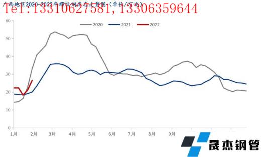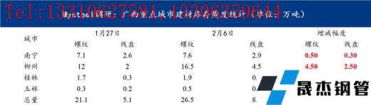 本周廣西建筑厚壁無縫鋼管價格小幅上漲,較節前上漲80元/噸。春節期間由于需求停滯,貿易商提貨較少,多數滯留在廠內,因而社庫庫存整體增加幅度較往年有所降低。商家整體心態尚可,對后市觀望情緒濃厚。截至昨日(正月初六)據我網跟蹤調研統計,廣西市場庫存建筑厚壁無縫鋼管34.6萬噸,較節前相比增加8.4萬噸,較去年節后同期相比減少5.9萬噸。從區域數據來看,南寧市場主要庫存資源為桂萬鋼,其商戶資源多數在廠內,只要節前零星商戶的資源到本倉庫,以及有云南材等資源,因而整體增加了0.8萬噸;而柳州市場由于柳鋼資源多數都會發往物流園,因而資源相對增加幅度較高,較春節前增加7萬噸。從整體庫存來看,廠家和社會庫存壓力尚在,但是隨著后期需求的釋放,或將有所緩解,短期本地市場價格或將繼續面臨小幅上漲。