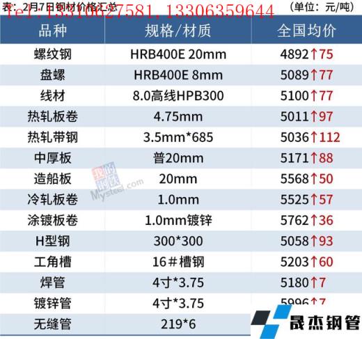 2月7日,國(guó)內(nèi)厚壁無(wú)縫鋼管市場(chǎng)價(jià)格較節(jié)前(1月30日)全線上漲,唐山普方坯出廠價(jià)較節(jié)前上漲100報(bào)4600元/噸。在期貨及無(wú)縫厚壁鋼管廠家助推下,貿(mào)易商普遍漲價(jià)。從成交方面來(lái)看,由于市場(chǎng)商戶多數(shù)還未正式開(kāi)工,主流區(qū)域零星成交,整體出貨較少。