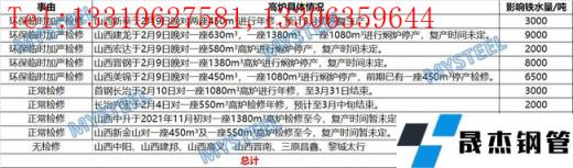 我網前兩日發布消息“河南、山東及河北唐山地區部分無縫厚壁鋼管廠家接到臨時限產加嚴通知。會在原有限產基礎上燒結全停,個別無縫厚壁鋼管廠家有新增高爐檢修,2月8日下午18點開始執行,預計11日解除。”對此,我網進行了進一步調研,山西部分區域也受之影響進行燜爐,具體情況如下: