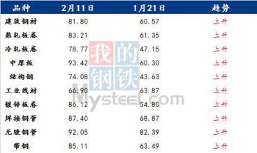 具體各品種指數(shù)來看,2月11日建筑厚壁無縫鋼管情緒指數(shù)為81.8,較1月21日回升21.23;熱軋板卷情緒指數(shù)為83.21,較1月21日回升21.86;冷軋板卷情緒指數(shù)為78.77,較1月21日回升31.62;中厚板情緒指數(shù)為93.42,較1月21日回升33.12;結(jié)構(gòu)鋼情緒指數(shù)為74.08,較1月21日回升30.45;工業(yè)線材情緒指數(shù)為66.9,較1月21日回升3.03;鍍鋅板卷情緒指數(shù)為86.12,較1月21日回升31.32;焊接厚壁鋼管情緒指數(shù)為87.4,較1月21日回升18.53;無縫厚壁鋼管情緒指數(shù)為92.05,較1月21日回升9.66;帶鋼情緒指數(shù)為85.11,較1月21日回升21.62。