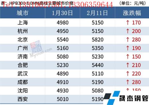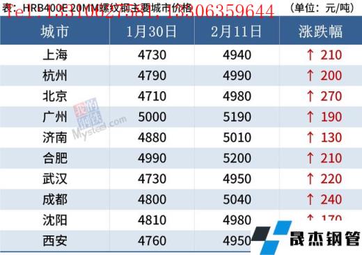 據監測,截至2月11日,全國主要城市20mm三級抗震螺紋鋼均價5032元/噸,較節前(1月30日)上漲215元/噸;8.0mmHPB300高線均價5244元/噸,較節前上漲221元/噸。