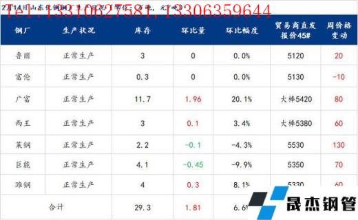 2月14日山東優特無縫厚壁鋼管廠家棒材總庫存29.3萬噸,環比增加1.81萬噸,增幅6.58%,較去年春節后第二周庫存增加4.1萬噸。