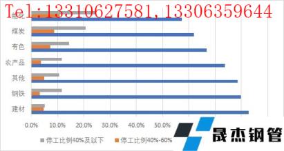 從不同行業的停工比例來看,鋼鐵、建材由于季節性生產和消費特征明顯,停工比例達到80%的企業數量明顯高于其他行業,且較去年相比,鋼鐵、建材行業停工比例達到80%及以上企業數量占比分別提高3.4和5.9個百分點。