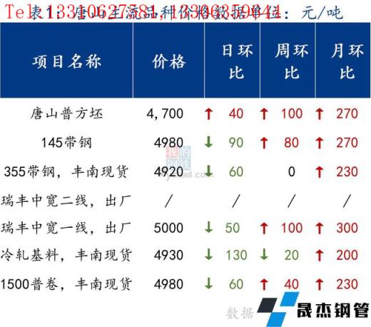 今日唐山管帶價格穩中回落,其中355帶鋼價格較上周五跌60元/噸,145帶鋼較上周跌90元/噸,管材價格暫且持穩。市場成交清淡,管長及帶無縫厚壁鋼管廠家產量不高,調坯軋材廠仍處于停產階段。