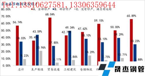 本次調研的3805家企業中,春節期間全部停產為2159家、占比56.74%,部分停產企業有1295家、占比34.03%,沒有停產或滿負荷運轉的企業有351家,占比為9.22%。較去年相比,今年放假比例有明顯提升,不停產或者滿負荷運轉的企業降低了7.5個百分點。