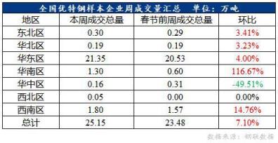2、本周全國優(yōu)特鋼棒材樣本企業(yè)成交量25.15萬噸,較節(jié)前一周成交增1.67,增幅7.1%,同比去年節(jié)后第一周上升2.23萬噸,增幅9.72%。