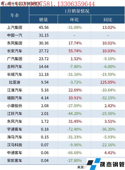 免責聲明:本網站(山東聊城晟杰無縫鋼管廠www.82912.cn)刊載的“1月我國汽車產銷降幅明顯,多數車企呈現雙位數下跌”等均源于網絡,版權歸原作者所有,且僅代表原作者觀點,本文所載信息僅供參考。轉載僅為學習與交流之目的,如無意中侵犯您的合法權益,請及時聯系刪除。本網站刊登此篇文章并不意味著本站贊同其觀點或證實其內容的真實性,我們不對其科學性、嚴肅性等作任何形式的保證。如果侵犯了您的版權,請盡快聯系我們予以撤銷,謝謝合作!