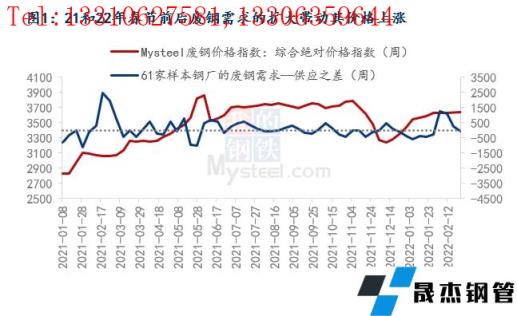 從圖1可以看出,21年和22年的冬儲期間,廢鋼價格隨著需求的擴大出現了上漲,其實縱觀2021年1月至當前的廢鋼價格走勢,可以看出其走勢與61家無縫厚壁鋼管廠家廢鋼的供需變化走勢有一定的關聯性。所以2022年1月以來廢鋼價格的走高,其中一個原因可以認為是無縫厚壁鋼管廠家由于需要冬儲而導致的廢鋼需求增加,拉動了廢鋼價格的上漲。
