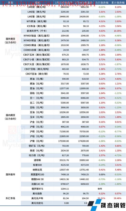 免責聲明:本網站(山東聊城晟杰無縫鋼管廠www.82912.cn)刊載的“受近期局勢影響大宗商品價格一覽表(2月28日)”等均源于網絡,版權歸原作者所有,且僅代表原作者觀點,本文所載信息僅供參考。轉載僅為學習與交流之目的,如無意中侵犯您的合法權益,請及時聯系刪除。本網站刊登此篇文章并不意味著本站贊同其觀點或證實其內容的真實性,我們不對其科學性、嚴肅性等作任何形式的保證。如果侵犯了您的版權,請盡快聯系我們予以撤銷,謝謝合作!