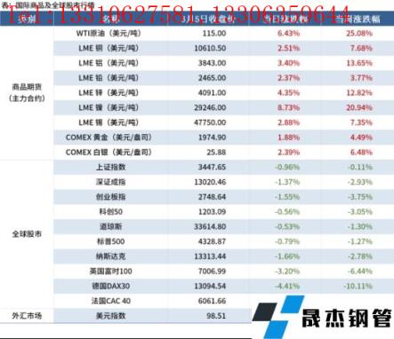 金融市場:本周主要商品期貨全部上漲,WTI原油大漲25.08%。全球股市全部下跌,歐洲股市跌幅靠前;美元指數98.51,上漲2.04%。