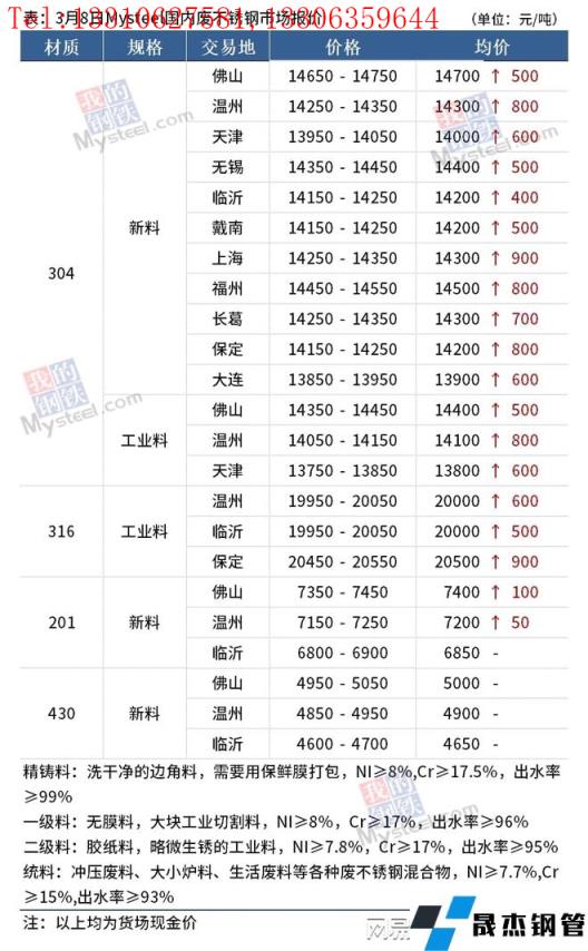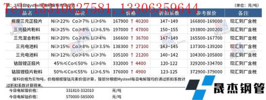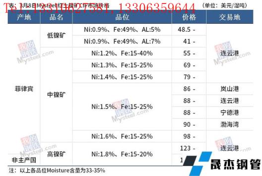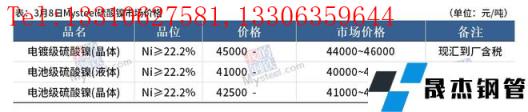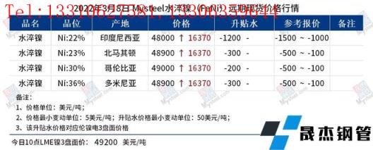 免責聲明:本網(wǎng)站(山東聊城晟杰無縫鋼管廠www.82912.cn)刊載的“鎳產(chǎn)業(yè)鏈價格(2022.3.8)”等均源于網(wǎng)絡(luò),版權(quán)歸原作者所有,且僅代表原作者觀點,本文所載信息僅供參考。轉(zhuǎn)載僅為學習與交流之目的,如無意中侵犯您的合法權(quán)益,請及時聯(lián)系刪除。本網(wǎng)站刊登此篇文章并不意味著本站贊同其觀點或證實其內(nèi)容的真實性,我們不對其科學性、嚴肅性等作任何形式的保證。如果侵犯了您的版權(quán),請盡快聯(lián)系我們予以撤銷,謝謝合作!