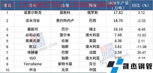以上為全球十大鎳生產商排名,2020 年全球鎳產量總計約 220 萬噸。詳情請點擊》》