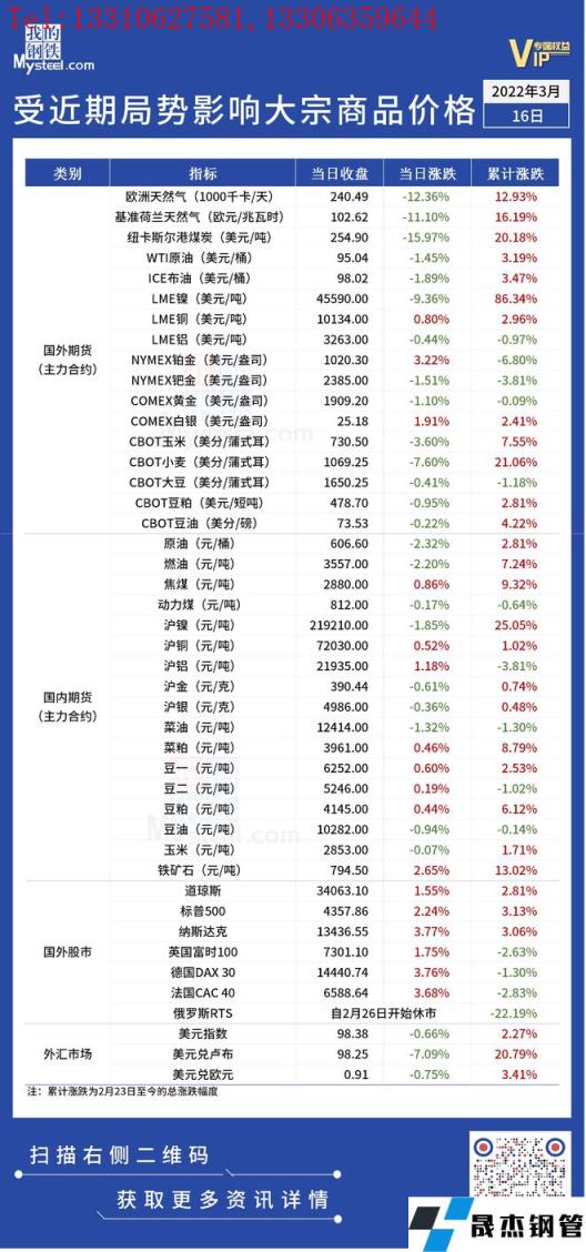 近期,受國際局勢影響,全球金融及大宗商品市場出現(xiàn)較大波動。據(jù)央視新聞報道,俄烏雙方準備好了一份在烏克蘭保持中立、裁軍的前提下實施的停火撤軍計劃,國際能源價格繼續(xù)大跌。倫敦金屬交易所則宣布,將不會發(fā)布周三收盤價,因為鎳價在收盤價確定期間處于跌停狀態(tài)。跌停價45590美元/噸將繼續(xù)用于LME清算所的保證金計算,以及周四漲跌停的基礎。另外,美聯(lián)儲加息如期而至,美國三大股指跌宕起伏走出V型反彈。匯總情況如下: