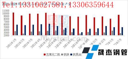 21年受國內(nèi)政策影響,五氧化二釩1-6月產(chǎn)量6.5萬噸,7-10月5.39萬噸,高出下半年20.6%;釩鐵1-6月產(chǎn)量2.06萬噸,7-10月1.94萬噸,高出下半年6.2%;釩氮合金1-6月3.54萬噸,7-10月2.68萬噸,高出下半年32%。2022年1-2月各類釩產(chǎn)品產(chǎn)量相對(duì)去年同期略有所減少,加之當(dāng)前國際形勢及馬上臨近下游基建建筑生產(chǎn)高峰,需求會(huì)相對(duì)增加,在利潤可觀的情況下,釩企生產(chǎn)高峰時(shí)段有望出現(xiàn)在上半年。