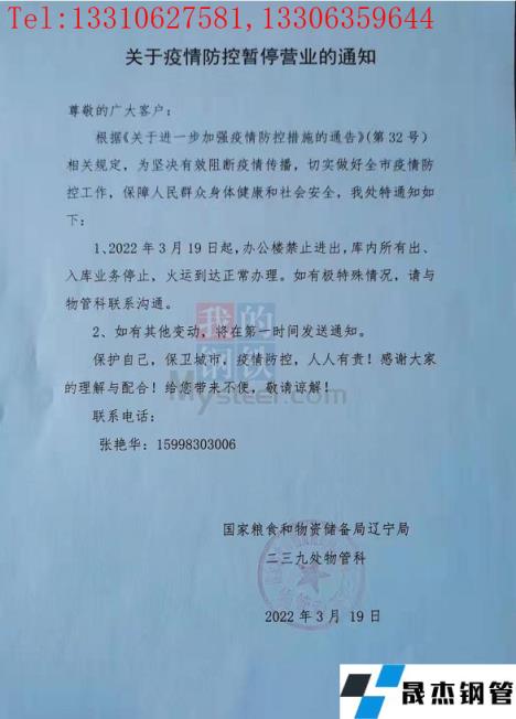 目前沈陽厚壁無縫鋼管中心批發(fā)市場已發(fā)布通告,19日起北一西路東西樓試試封閉管控、嚴禁人員進入辦公,出庫業(yè)務暫停、火車到達正常辦理;中國兵工物資125庫通告19日起嚴禁人員進入庫區(qū)辦公,出庫業(yè)務暫停、火車到達正常辦理;國家糧食和物資儲備局遼寧局二三九處通告19日起辦公樓嚴禁進出,庫內(nèi)所有出入庫業(yè)務暫停、火運到達正常辦理。市內(nèi)其他主要厚壁無縫鋼管市場反饋暫時正常辦公及出庫,但從防控指揮部通告內(nèi)容來看、也有暫停營業(yè)的傾向。(通告見文末圖片)