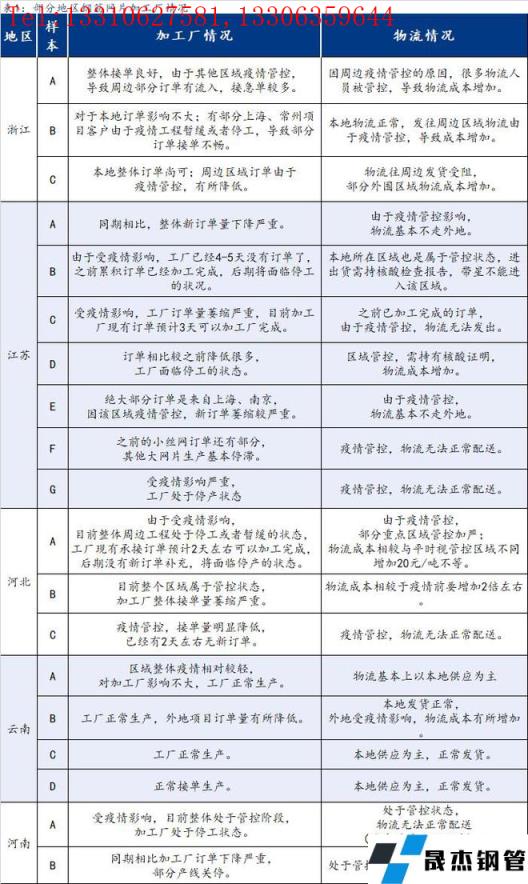 截至3月23日,匯總了部分省份19家鋼筋網(wǎng)片加工廠最新信息,其中浙江3家,江蘇7家,河北3家,云南4家,河南2家。從調(diào)研結(jié)果來看,江蘇、河北、河南受疫情影響較嚴(yán)重,因工程項(xiàng)目停工或者暫緩對(duì)于網(wǎng)片需求整體有遞延,導(dǎo)致加工廠新訂單相較于往年有個(gè)明顯的萎縮,部分沒有受太大影響的區(qū)域物流成本也有相應(yīng)的增加。具體情況如下:
