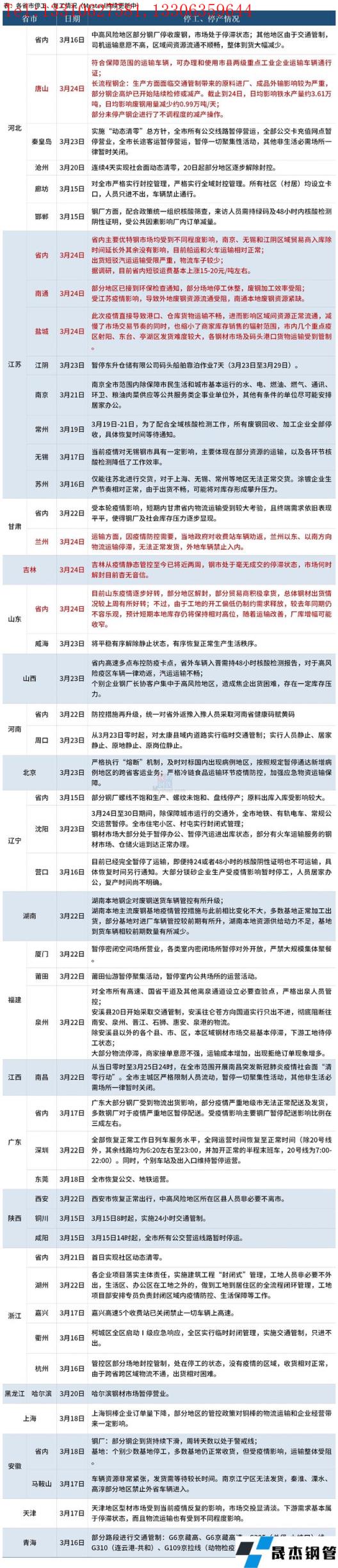 截至3月25日,匯總了20個(gè)省份停工復(fù)工最新信息。其中,河北唐山市符合保障范圍的運(yùn)輸車輛,可辦理和使用市縣兩級(jí)重點(diǎn)工業(yè)企業(yè)運(yùn)輸車輛通行證。江蘇南通部分地區(qū)已接到環(huán)保檢查通知,部分場(chǎng)地停工休整,廢鋼加工效率受阻。吉林從疫情靜態(tài)管控至3月24日將近兩周,鋼市處于毫無成交的停滯狀態(tài),市場(chǎng)何時(shí)解封目前杳無音信。具體情況如下: