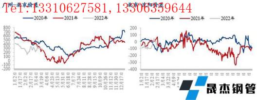 目前北京價格居于低位,不過從南北價差的歷史數(shù)據(jù)來看,廣州-北京價差不足300元/噸,也屬于偏低水平;雖然目前東北區(qū)域價格略高于北京,但是東北區(qū)域受疫情影響較大,汽運運輸受阻,資源消化艱難,其中沈陽建筑厚壁無縫鋼管市場庫存量已經(jīng)創(chuàng)出有調(diào)研數(shù)據(jù)以來的峰值,市場有一定的庫存壓力,因此在華南價格優(yōu)勢不大,又在緩解東北區(qū)域壓力的前提下,北京以及京津冀其他區(qū)域仍是東北區(qū)域無縫厚壁鋼管廠家(凌鋼、新?lián)徜摰龋┵Y源輸送的主要區(qū)域。