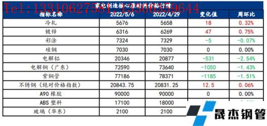 截止2022年5月6日,各原材料當日即時價格以及價格周環比情況如下: