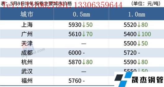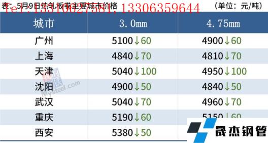 熱軋板卷:5月9日,全國24個主要城市4.75mm熱軋板卷均價5067元/噸,較上個交易日下跌60元/噸。綜合來看,美聯儲加息和縮表落地限制了國內貨幣寬松的空間,國內多地區疫情爆發,國內外的雙重因素導致情緒不佳,無縫厚壁鋼管廠家目前面臨虧損的局面,焦煤焦炭的首輪提降已經落地,原料端價格支撐進行弱化,原料與成材呈現負反饋。預計下半年經濟沖擊影響依舊,短期成材或將維持偏弱態勢。因此,預計全國熱軋板卷10日價格維持下行趨勢。
