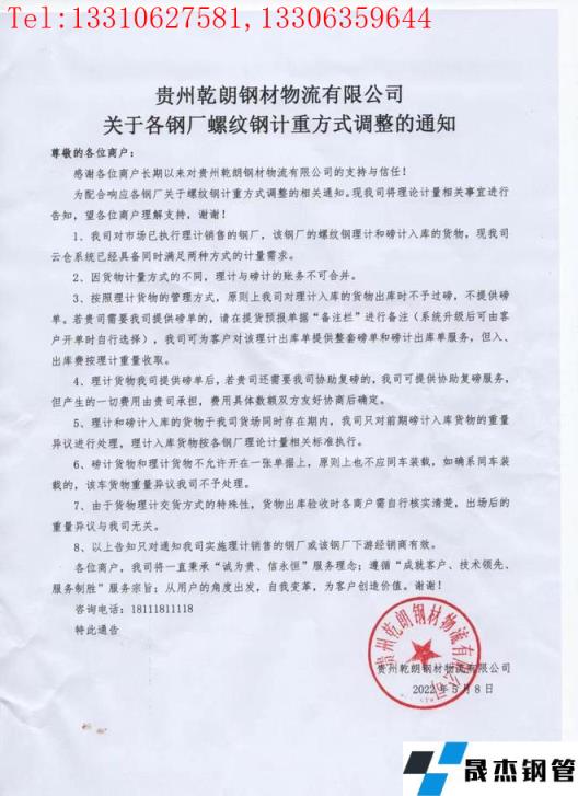 免責(zé)聲明:本網(wǎng)站(山東聊城晟杰無縫鋼管廠www.82912.cn)刊載的“貴州乾朗鋼材_無縫鋼管物流有限公司關(guān)于各無縫鋼管廠家螺紋鋼計重方式調(diào)整的通知”等均源于網(wǎng)絡(luò),版權(quán)歸原作者所有,且僅代表原作者觀點,本文所載信息僅供參考。轉(zhuǎn)載僅為學(xué)習(xí)與交流之目的,如無意中侵犯您的合法權(quán)益,請及時聯(lián)系刪除。本網(wǎng)站刊登此篇文章并不意味著本站贊同其觀點或證實其內(nèi)容的真實性,我們不對其科學(xué)性、嚴(yán)肅性等作任何形式的保證。如果侵犯了您的版權(quán),請盡快聯(lián)系我們予以撤銷,謝謝合作!