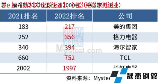 免責聲明:本網站(山東聊城晟杰無縫鋼管廠www.82912.cn)刊載的“中國5家家電企業上榜福布斯2022全球企業2000強”等均源于網絡,版權歸原作者所有,且僅代表原作者觀點,本文所載信息僅供參考。轉載僅為學習與交流之目的,如無意中侵犯您的合法權益,請及時聯系刪除。本網站刊登此篇文章并不意味著本站贊同其觀點或證實其內容的真實性,我們不對其科學性、嚴肅性等作任何形式的保證。如果侵犯了您的版權,請盡快聯系我們予以撤銷,謝謝合作!