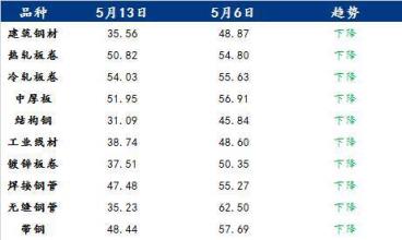 具體各品種指數來看,5月13日建筑厚壁無縫鋼管情緒指數為35.56,較5月6日回落13.31;熱軋板卷情緒指數為50.82,較5月6日回落3.98;冷軋板卷情緒指數為54.03,較5月6日回落1.6;中厚板情緒指數為51.95,較5月6日回落4.96;結構鋼情緒指數為31.09,較5月6日回落14.75;工業線材情緒指數為38.74,較5月6日回落9.86;鍍鋅板卷情緒指數為37.51,較5月6日回落12.84;焊接厚壁鋼管情緒指數為47.48,較5月6日回落7.79;無縫厚壁鋼管情緒指數為35.23,較5月6日回落27.27;帶鋼情緒指數為48.44,較5月6日回落9.25。