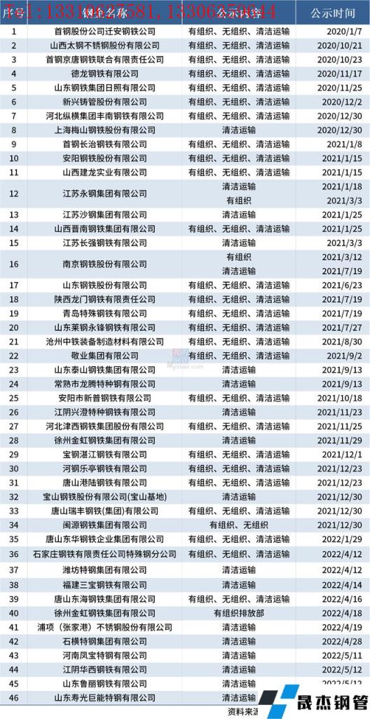 自2020年8月起,中國鋼鐵工業協會開展了鋼鐵企業超低排放改造和評估監測進展情況公示工作。截至2022年5月13日,已有46家鋼鐵企業在鋼協網站進行公示。5月以來新增4家企業,分別為河南鳳寶特鋼有限公司、江陰華西鋼鐵有限公司、山東魯麗鋼鐵有限公司和山東壽光巨能特鋼有限公司。