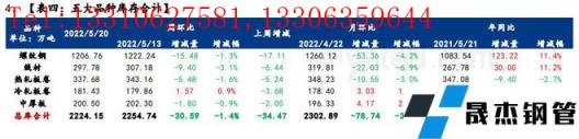 庫存方面,五大品種厚壁無縫鋼管總庫存環比上周降幅擴張,降至2224.15萬噸,環比上周減少30.59萬噸,降幅1.36%。分品種看,建材庫存減少24.88萬噸,降幅1.6%;板材庫存減少5.71萬噸,降幅0.8%;分指標看,五大品種無縫厚壁鋼管廠家庫存環比減少1.43萬噸,降幅0.2%;五大品種社會庫存環比減少29.16萬噸,降幅1.9%。