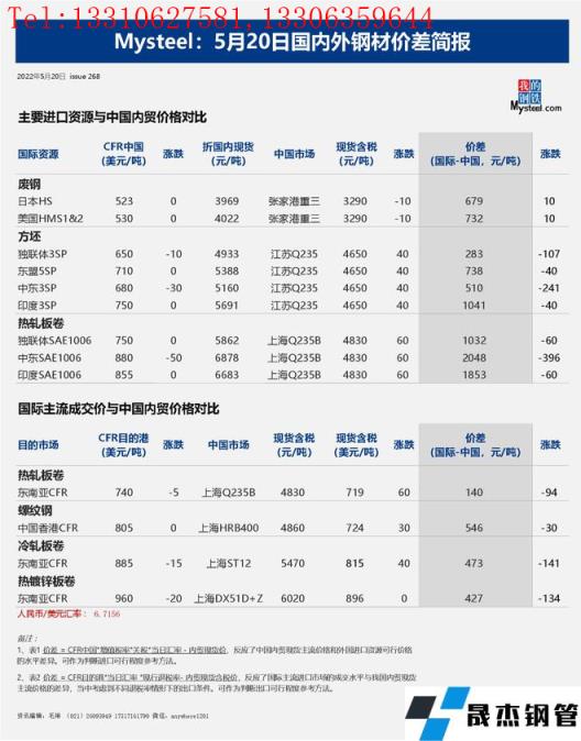 免責聲明:本網站(山東聊城晟杰無縫鋼管廠www.82912.cn)刊載的“2022年05月20日日報:國內外鋼材_無縫鋼管價差匯總(2022.5.20)”等均源于網絡,版權歸原作者所有,且僅代表原作者觀點,本文所載信息僅供參考。轉載僅為學習與交流之目的,如無意中侵犯您的合法權益,請及時聯系刪除。本網站刊登此篇文章并不意味著本站贊同其觀點或證實其內容的真實性,我們不對其科學性、嚴肅性等作任何形式的保證。如果侵犯了您的版權,請盡快聯系我們予以撤銷,謝謝合作!