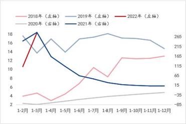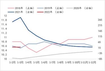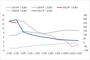 從基礎(chǔ)設(shè)施投資增速和房地產(chǎn)開發(fā)投資增速來看(涉及到對(duì)應(yīng)年份走勢(shì)使用左右軸的區(qū)分目的與固定資產(chǎn)投資增速指標(biāo)的說明一致),兩個(gè)指標(biāo)在2020年-2021年非正常環(huán)境條件下的年份增速趨勢(shì)基本一致,但在正常環(huán)境條件下的年份增速可以看到,伴隨湖北省每年所需完成的經(jīng)濟(jì)增長(zhǎng)目標(biāo)的大背景下,此兩項(xiàng)指標(biāo)的增速表現(xiàn)呈現(xiàn)此消彼長(zhǎng)的走勢(shì)。而結(jié)合斜率來看,進(jìn)入2022年1-3月,基礎(chǔ)設(shè)施投資增速呈現(xiàn)明顯快速恢復(fù)或釋放態(tài)勢(shì),而房地產(chǎn)開發(fā)投資增速則呈現(xiàn)明顯放緩態(tài)勢(shì)。由此看來,對(duì)于建筑厚壁無縫鋼管品種的需求將在房地產(chǎn)板塊的萎縮預(yù)期更為明顯,這與目前所處的房地產(chǎn)調(diào)控政策背景是相符的,即便有所改善,筆者認(rèn)為仍暫難有實(shí)質(zhì)上的新刺激,而基礎(chǔ)設(shè)施投資或?qū)⑹峭械椎闹我蛩刂?。綜合來看,湖北省宏觀指標(biāo)數(shù)據(jù)的預(yù)期演變表明對(duì)于建筑厚壁無縫鋼管品種的需求預(yù)期呈現(xiàn)萎縮態(tài)勢(shì),這與產(chǎn)能角度的供應(yīng)增加形成供需矛盾加劇的預(yù)期,因此這是導(dǎo)致建筑厚壁無縫鋼管價(jià)格偏低運(yùn)行的外因之一。