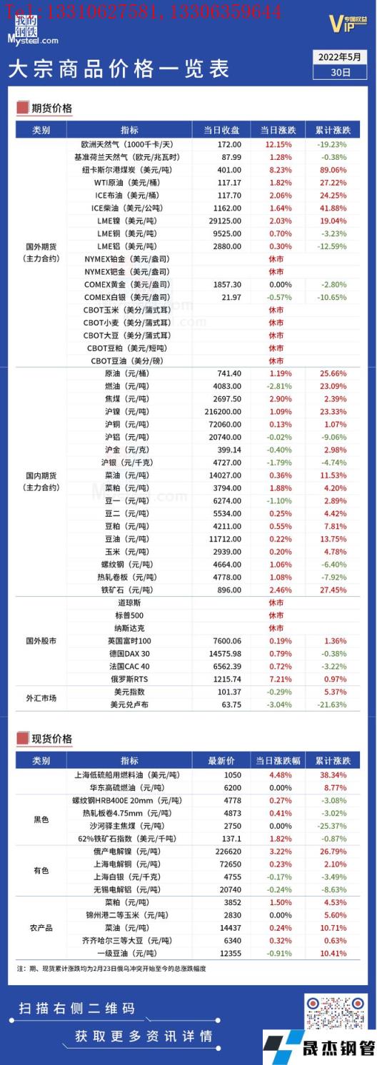 免責聲明:本網站(山東聊城晟杰無縫鋼管廠www.82912.cn)刊載的“俄烏局勢丨大宗商品價格一覽表(5月30日)”等均源于網絡,版權歸原作者所有,且僅代表原作者觀點,本文所載信息僅供參考。轉載僅為學習與交流之目的,如無意中侵犯您的合法權益,請及時聯系刪除。本網站刊登此篇文章并不意味著本站贊同其觀點或證實其內容的真實性,我們不對其科學性、嚴肅性等作任何形式的保證。如果侵犯了您的版權,請盡快聯系我們予以撤銷,謝謝合作!